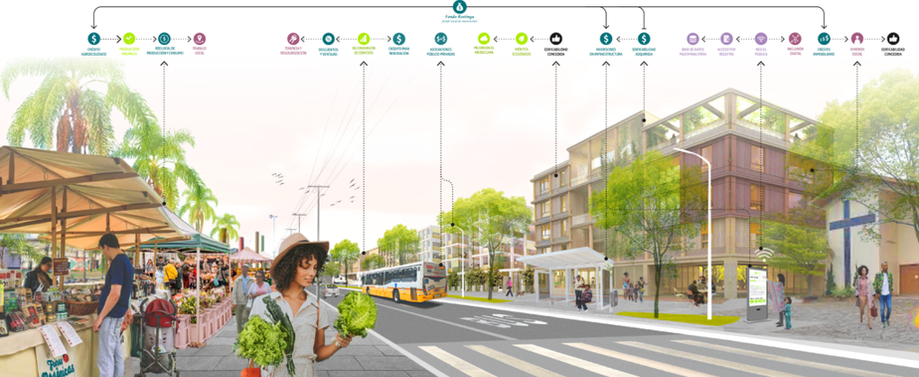 Relacionada às estratégias de fomentar a economia local, conectar para fora, integrar paisagens, reestruturar a mobilidade, aumentar o capital simbólico e reduzir a pegada ecológica, a proposta de entrelaçamento de conectividades engloba medidas de integração entre equipamentos existentes e propostos, reestruturação da mobilidade local, além da provisão de infraestrutura digital. A proposta busca identificar e potencializar a vocação do bairro, "aproveitando o que há disponível localmente", uma premissa da Economia Azul (Pauli, 2010). É elaborada uma relação de circularidade entre os equipamentos existentes e propostos no que diz respeito ao consumo de recursos e disposição de resíduos. Os equipamentos propostos são hortas urbanas comunitárias nos espaços públicos abandonados, uma usina de biogás e um centro de produção de fertilizantes. As hortas comunitárias, além de proporcionar geração de alimentos a quilômetro zero e interação comunitária, podem constituir uma rede de produção agroecológica em parceria com os produtores rurais do entorno do bairro. A produção de alimentos orgânicos pode ser destinada parte para os trabalhadores da iniciativa e parte para venda na feira semanal do bairro. A mobilidade urbana do bairro é reestruturada, tendo como foco a conectividade entre equipamentos e espaços públicos. Devido à estrutura urbana predominantemente ortogonal do bairro, foi possível adotar um esquema inspirado no modelo das superilles de Barcelona, com a definição de vias principais e vias locais conformando superquadras. Além das superquadras, a via arterial que corta o bairro e representa o principal acesso do bairro é mantida como eixo estruturante, valendo-se de premissas de Desenvolvimento Orientado ao Transporte Sustentável - DOTS (Calthorpe, 1993).